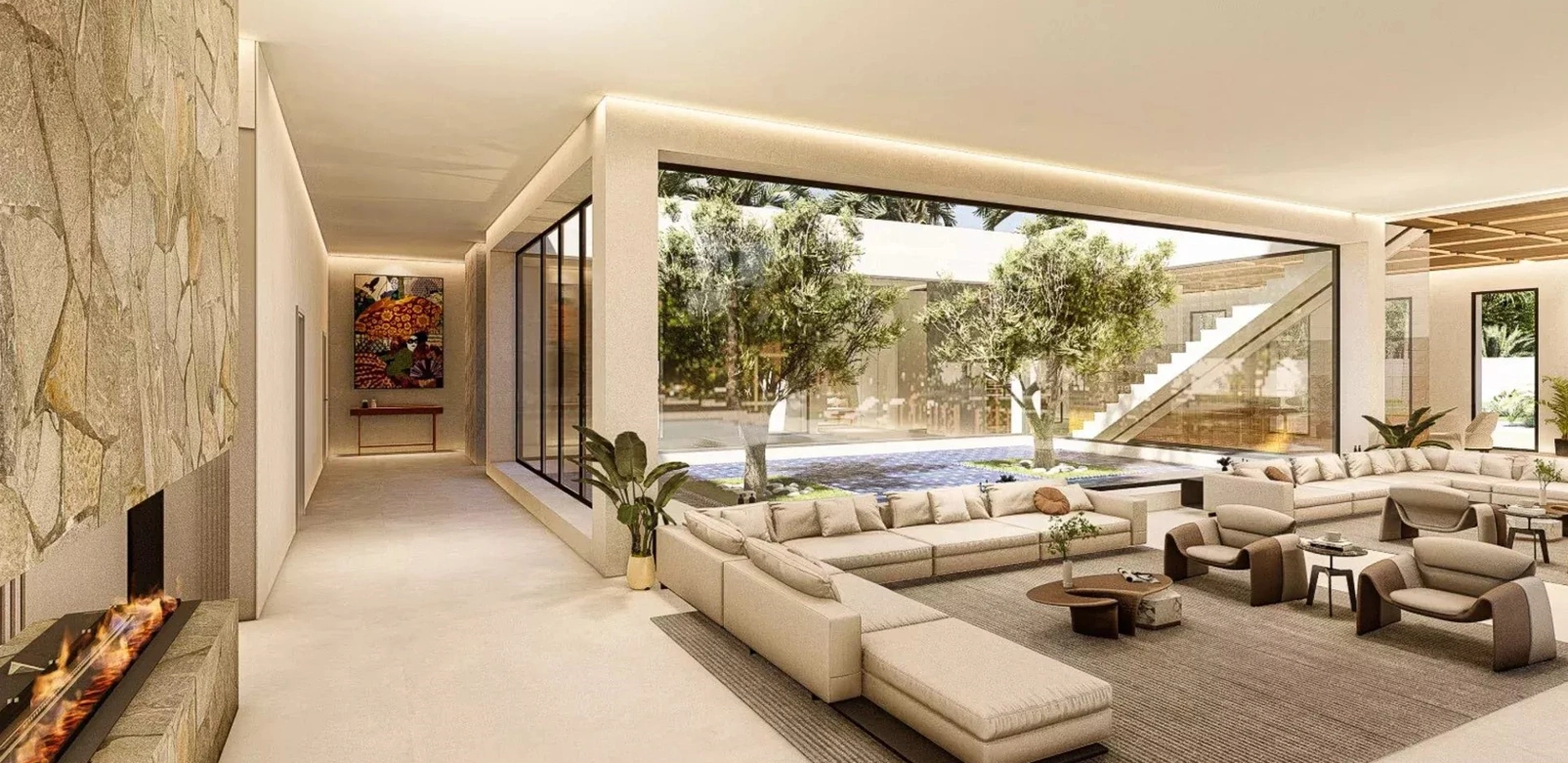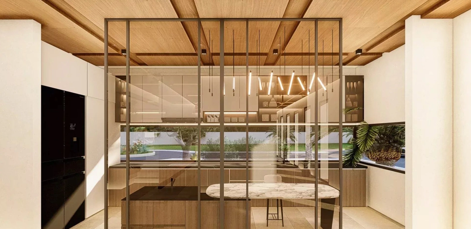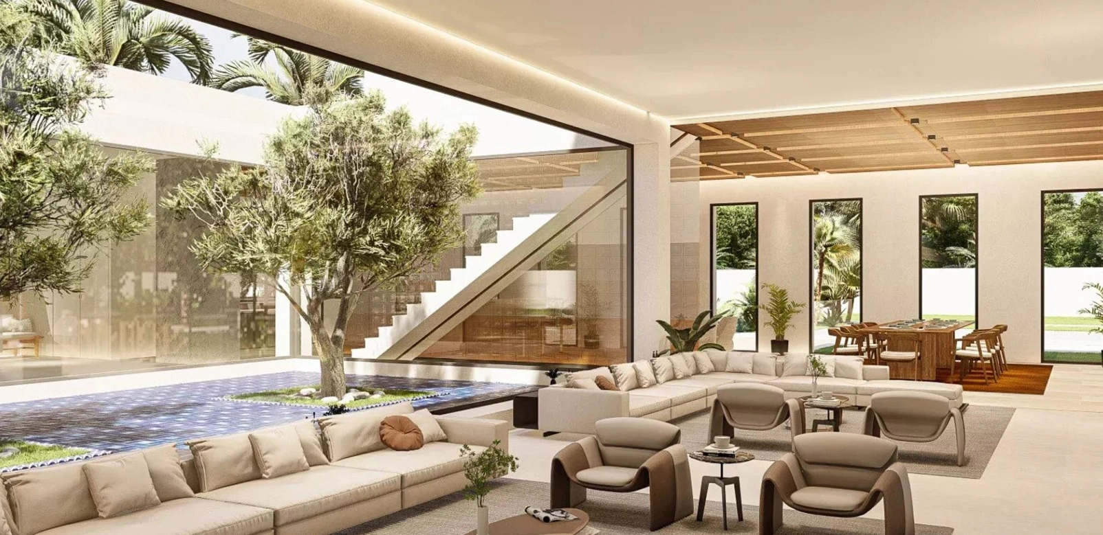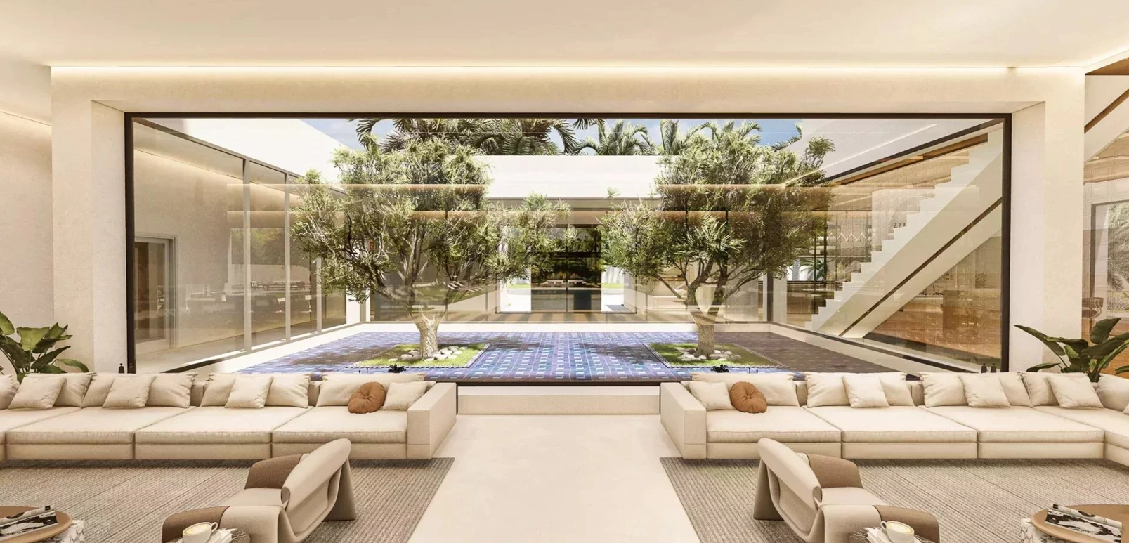 L’entrée s’ouvre sur des espaces de vie lumineux et accueillants, organisés autour d’un patio central qui inonde la maison de lumière et crée une atmosphère paisible.