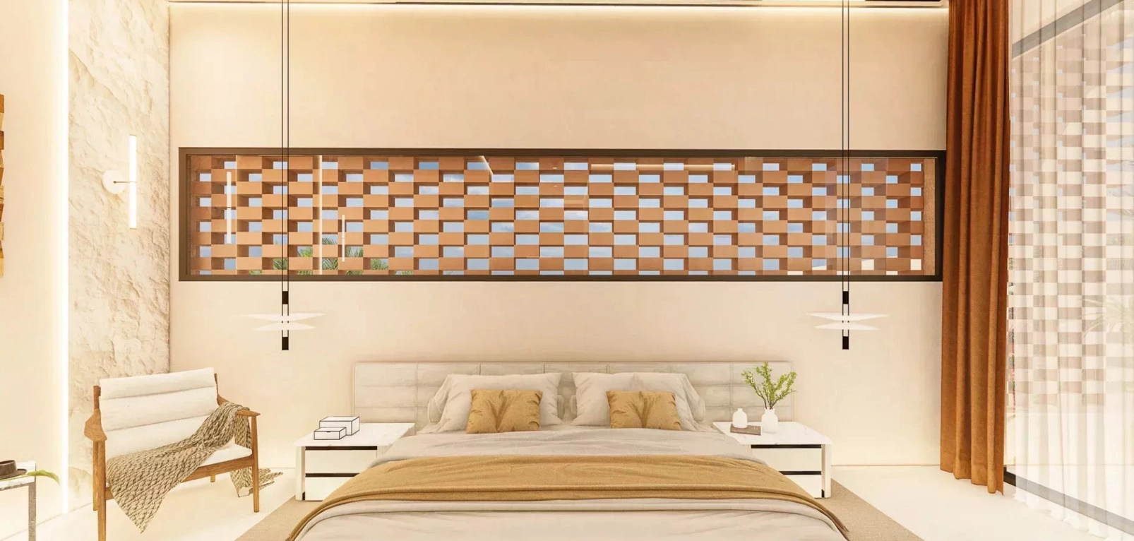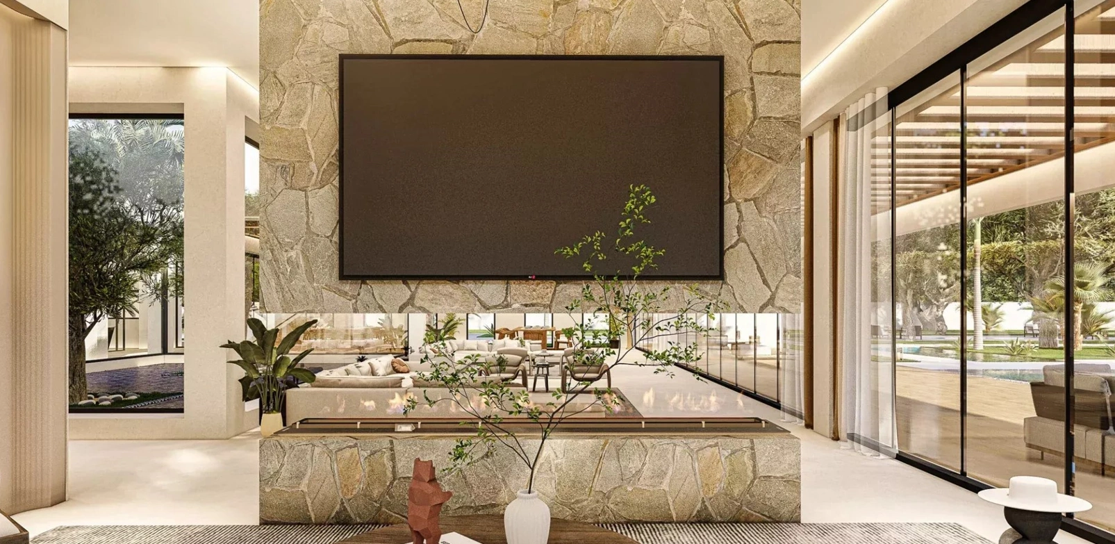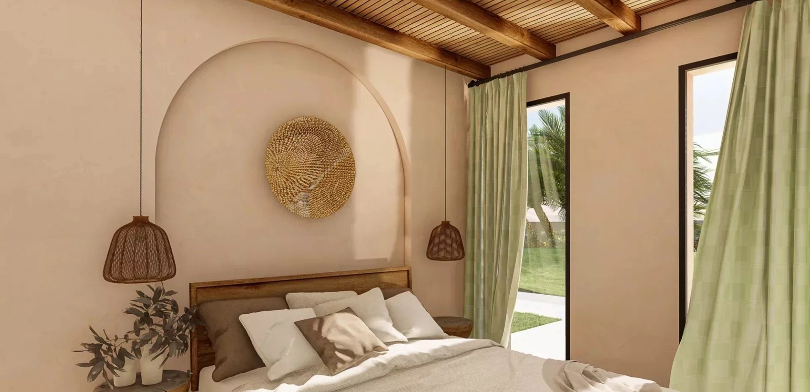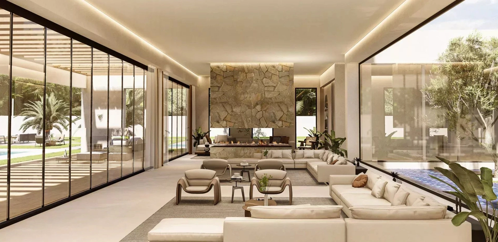 L’entrée s’ouvre sur des espaces de vie lumineux et accueillants, organisés autour d’un patio central qui inonde la maison de lumière et crée une atmosphère paisible.